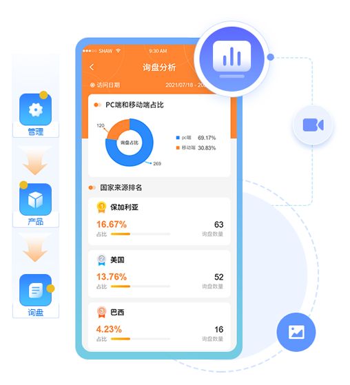 询盘来路、询盘国家、询盘趋势、询盘终端等数据和趋势。